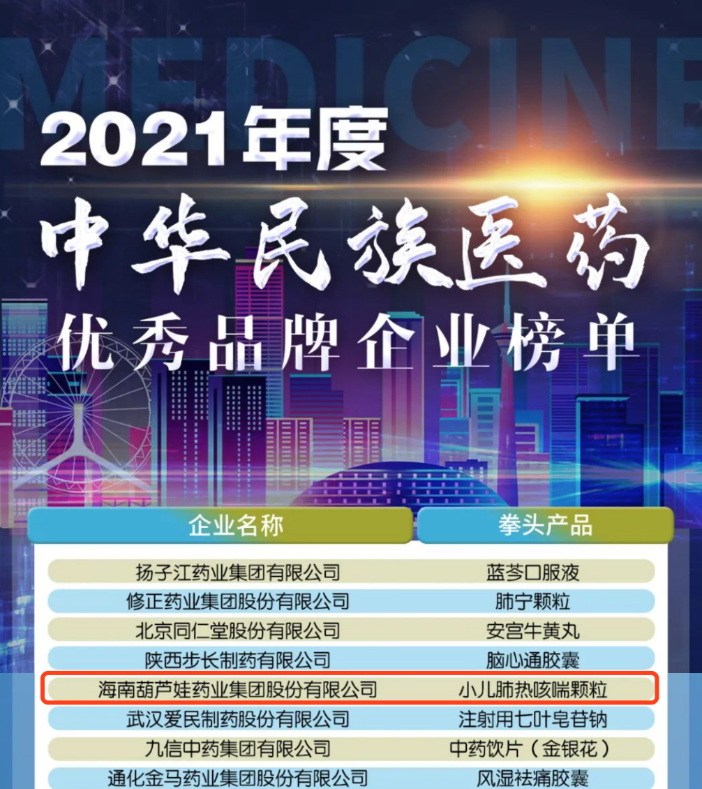 12月29日,全国工商联医药业商会发布了“2021年度中华民族医药优秀品牌企业榜单”,尊龙官方网站药业集团凭借黄金单品小儿肺热咳喘颗粒(4克)实力登榜。