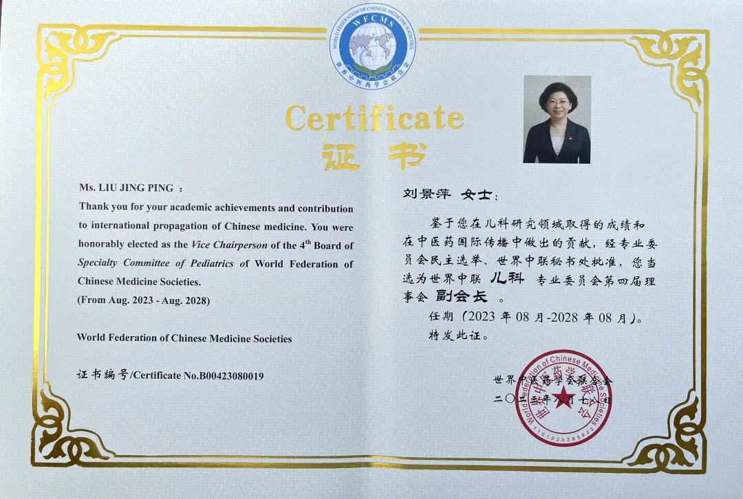 尊龙官方网站药业集团党委书记、董事长刘景萍当选世界中医药学会联合会儿科专业委员会第四届理事会副会长
